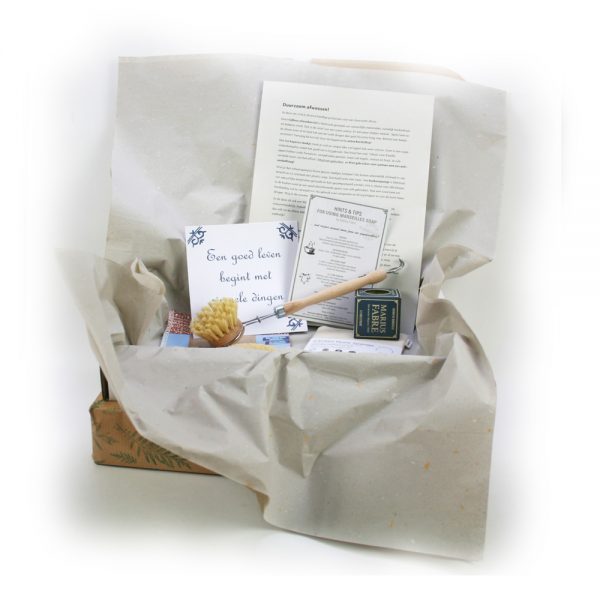 Cadeauset voor een duurzame afwas. Indien gewenst ook voorzien van een duurzaam maar smaakvol cadeaupapier. De cadeauset bestaat uit: