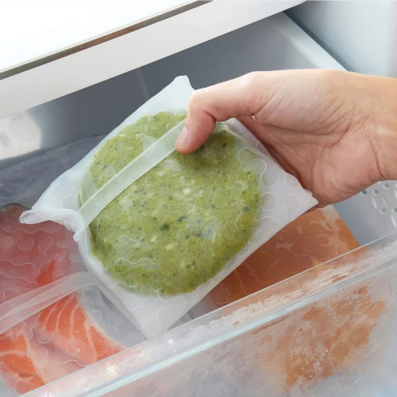 Het is geen zakje, dus het is niet geschikt om vloeibare voeding in te doen. Maar verder geschikt voor boterhammen, stukken groente of fruit, vlees, kaas, vis, eigenlijk alles.
