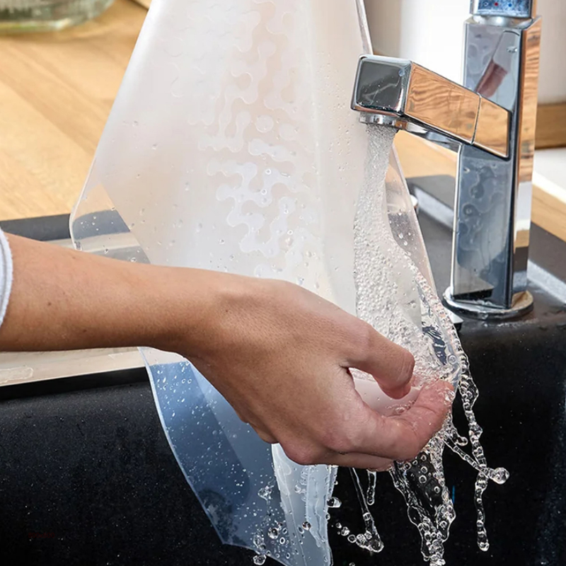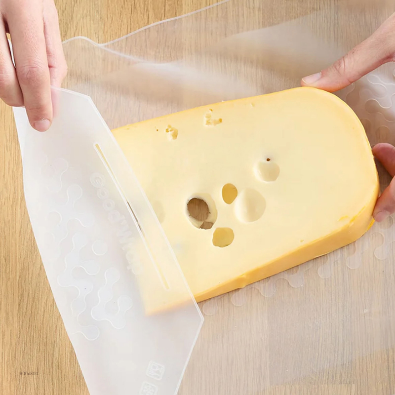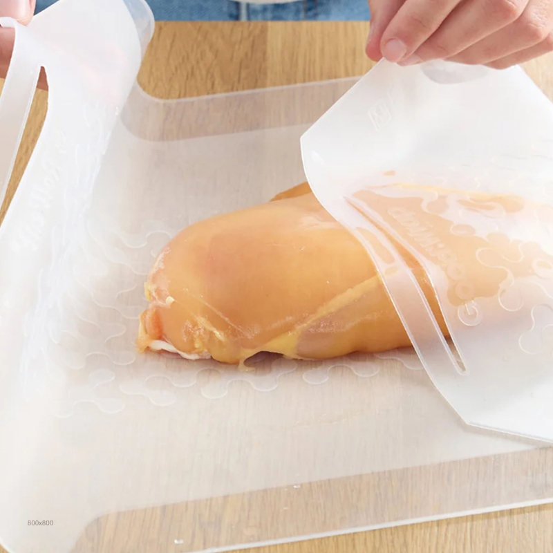 De randjes van de wrap zijn voorzien van een wat plakkerig randje. Dat is geen lijm of zo maar gewoon een aangepaste structuur van de siliconen waardoor ze plakkerig zijn. En zo kan je de wrap, bijna gelijk als bijvoorbeeld plastic keukenfolie, sluiten tot een pakketje, mits je het zo weet te plooien dat beide plakkerige stukjes elkaar raken. Ook zit er aan elke korte kant een uitsparing die je kunt gebruiken om de wrap vast te zetten door hem om het pakketje te trekken. De wraps zijn trouwens van transparante siliconen gemaakt dus je kunt zien wat er in zit. Met een whiteboard marker kan je er makkelijk een datum op schrijven zodat je weet hoe lang iets in de vriezer ligt.