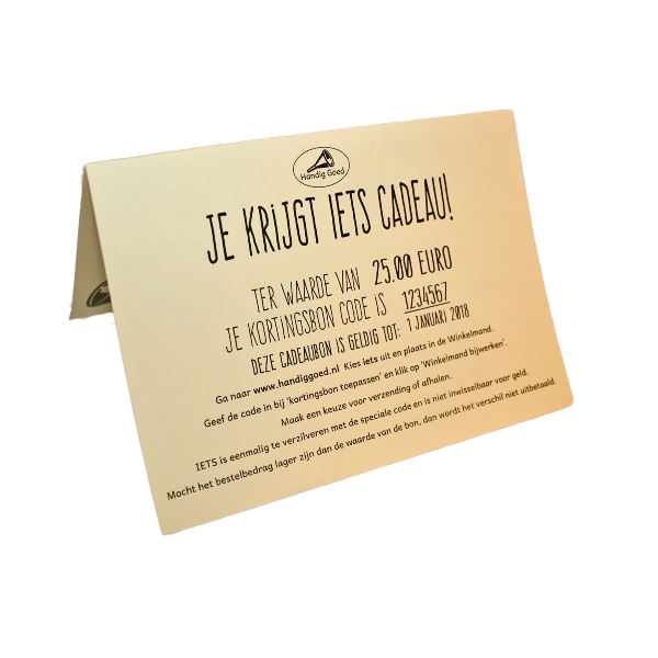 Wil je iets handigs geven maar je weet niet wat? Geef dan IETS! Wat is dat IETS? Een cadeaubon die de ontvanger kan besteden in de webwinkel van Handig Goed! Zo kan men kiezen waar men echt wat aan heeft. Je kunt IETS via de mail ontvangen zodat je het zelf kunt uitprinten en cadeau kunt geven, of door kan sturen. Of ik print IETS uit en stuur het via de post naar jou of direct naar de ontvanger. IETS is een fijne oplossing voor een last minute cadeau waar iemand toch echt wat aan heeft.